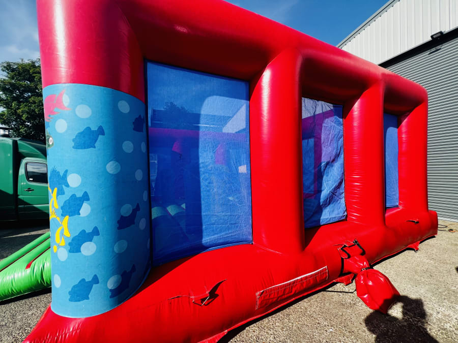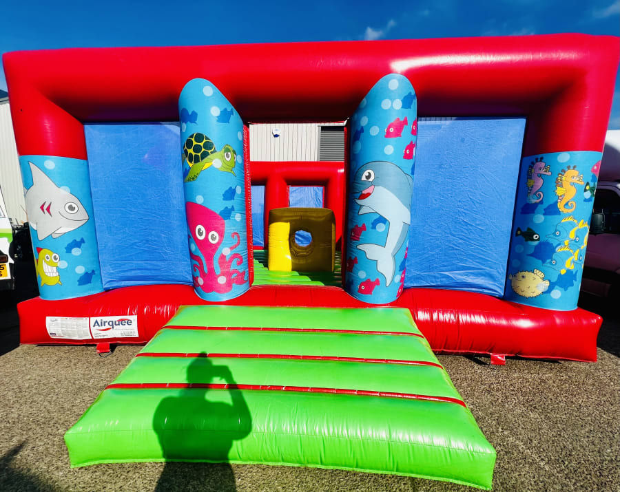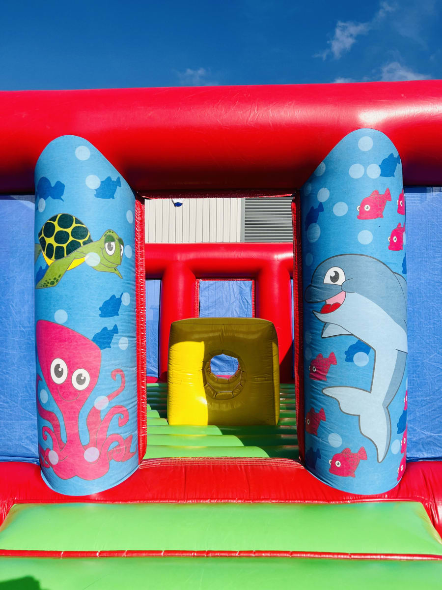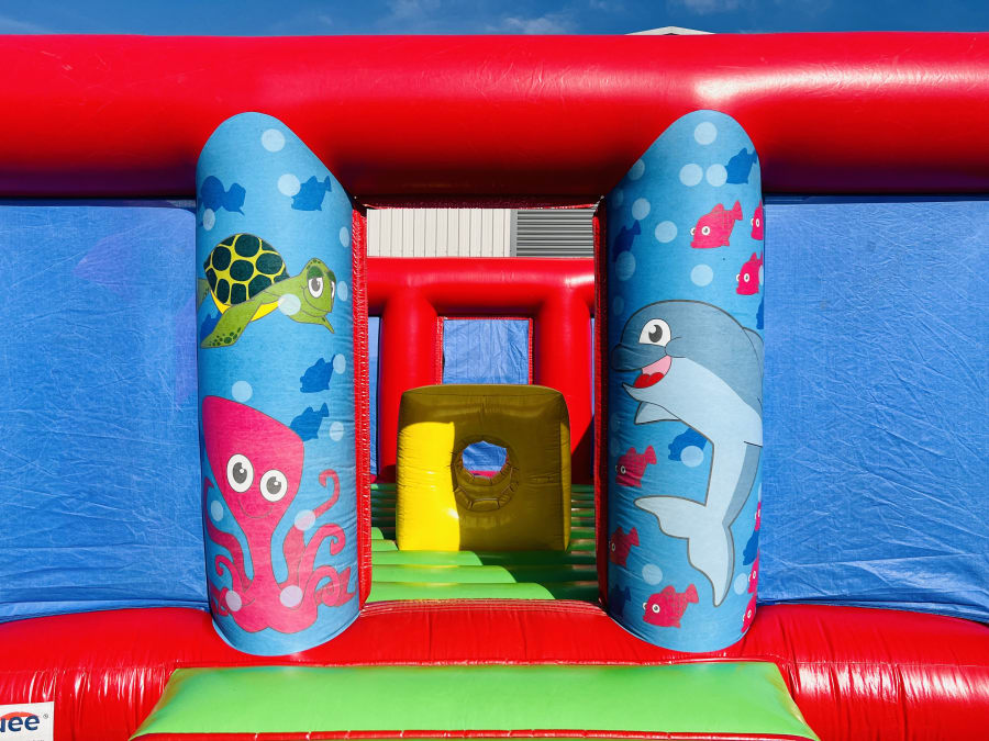 Explore a magical underwater world with this vibrant inflatable castle full of sea-themed challenges! Perfect for kids to climb, bounce, and play among the waves of fun.